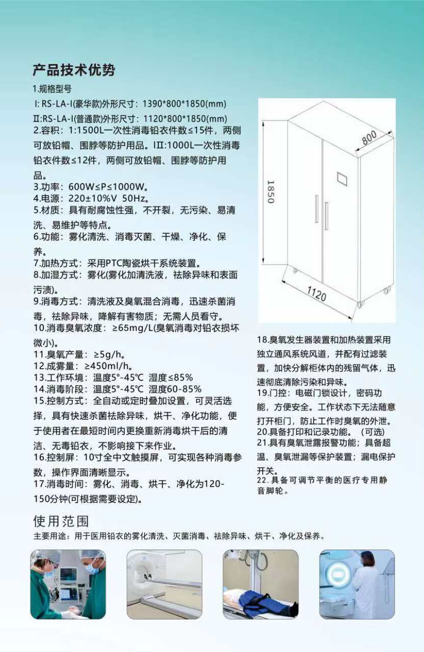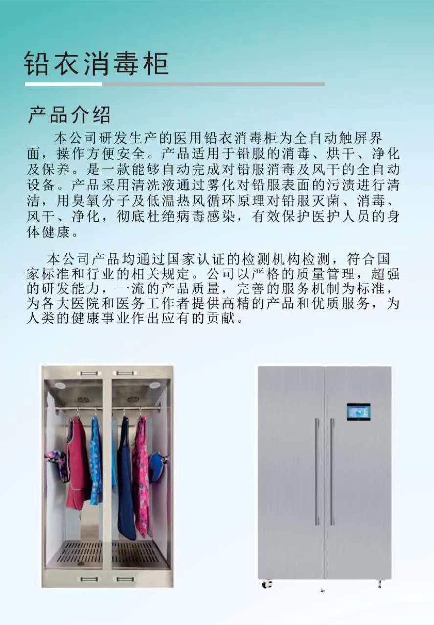 本公司研發(fā)生產(chǎn)的醫(yī)用鉛衣消毒柜為全自動觸屏界面,操作方便安全。產(chǎn)品適用于鉛服的消毒、烘干、凈化及保養(yǎng)。是一款能夠自動完成對鉛服消毒及風(fēng)干的全自動設(shè)備。